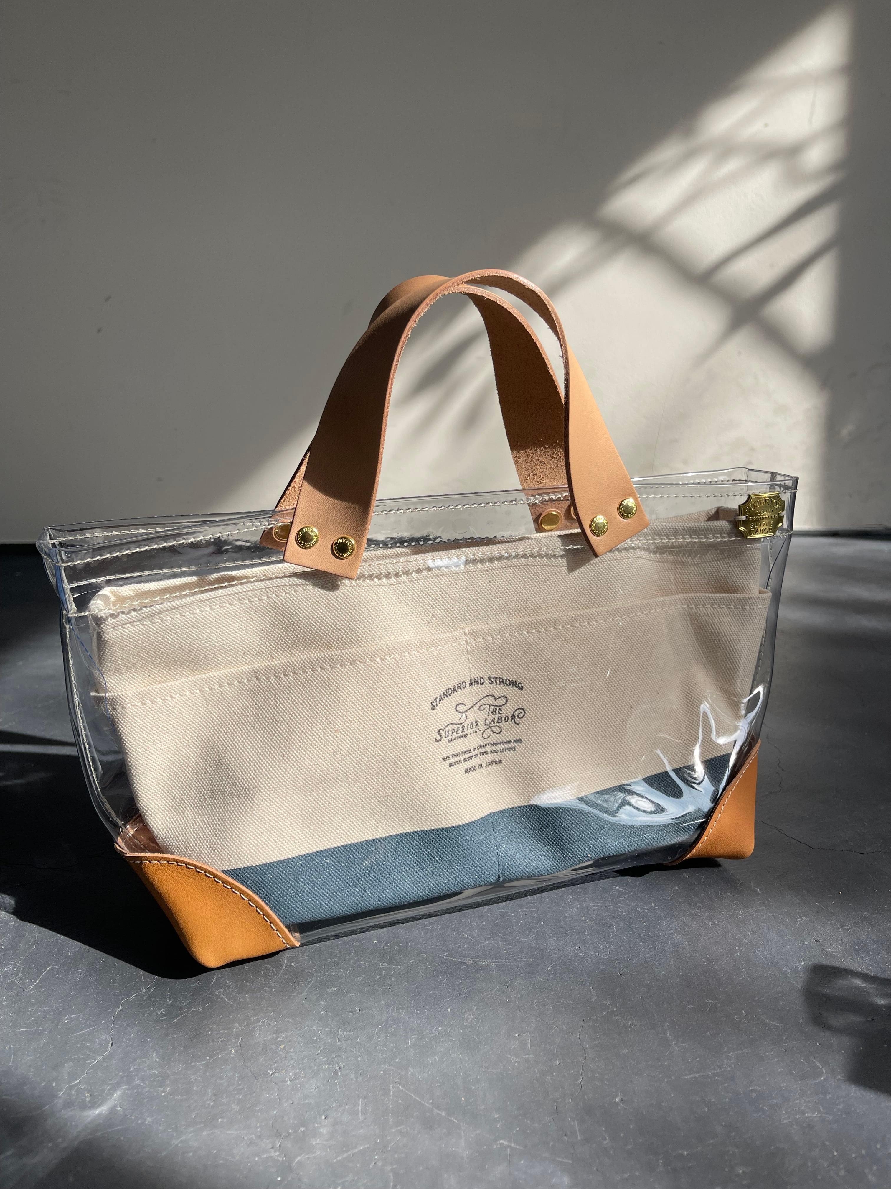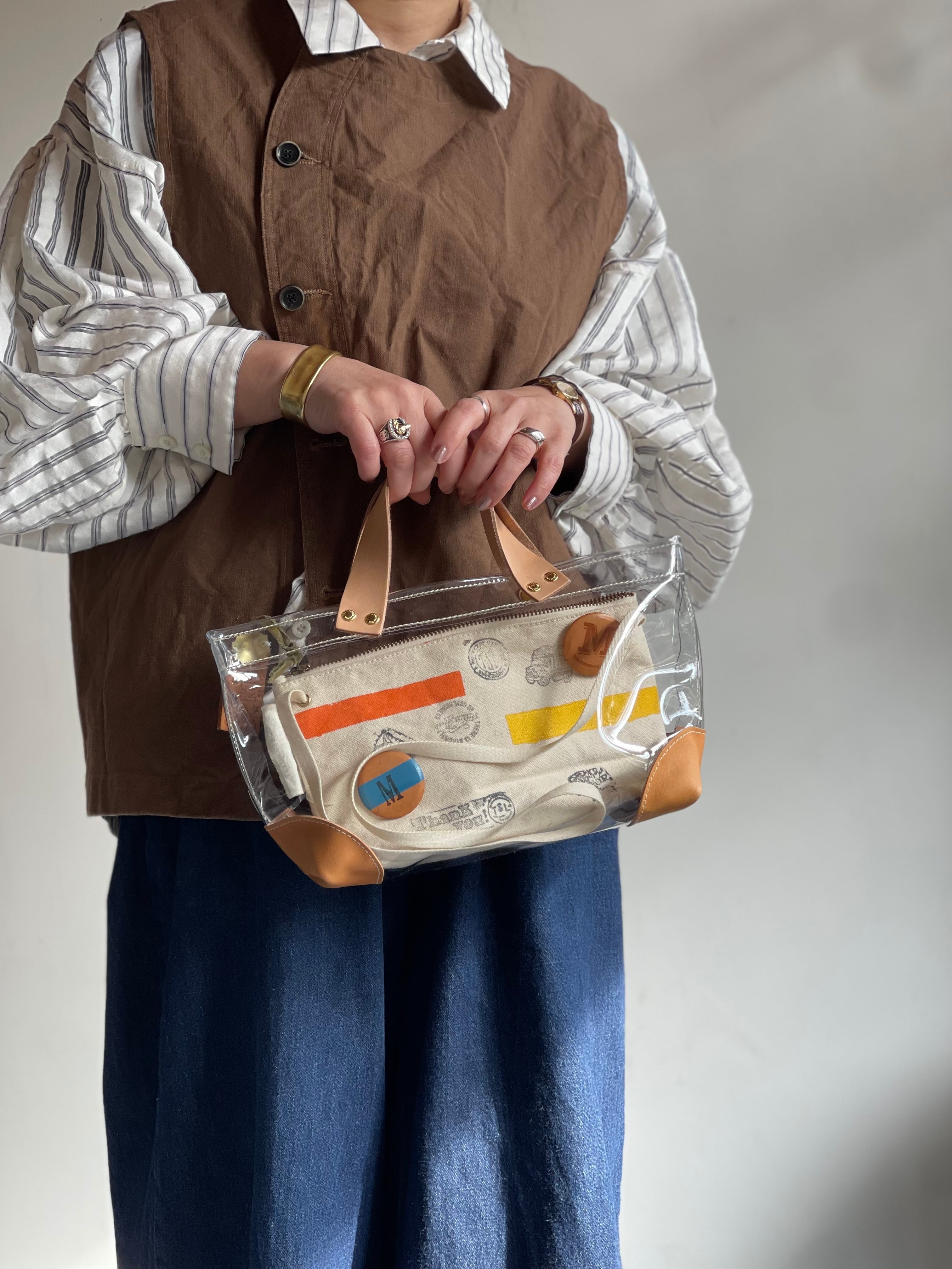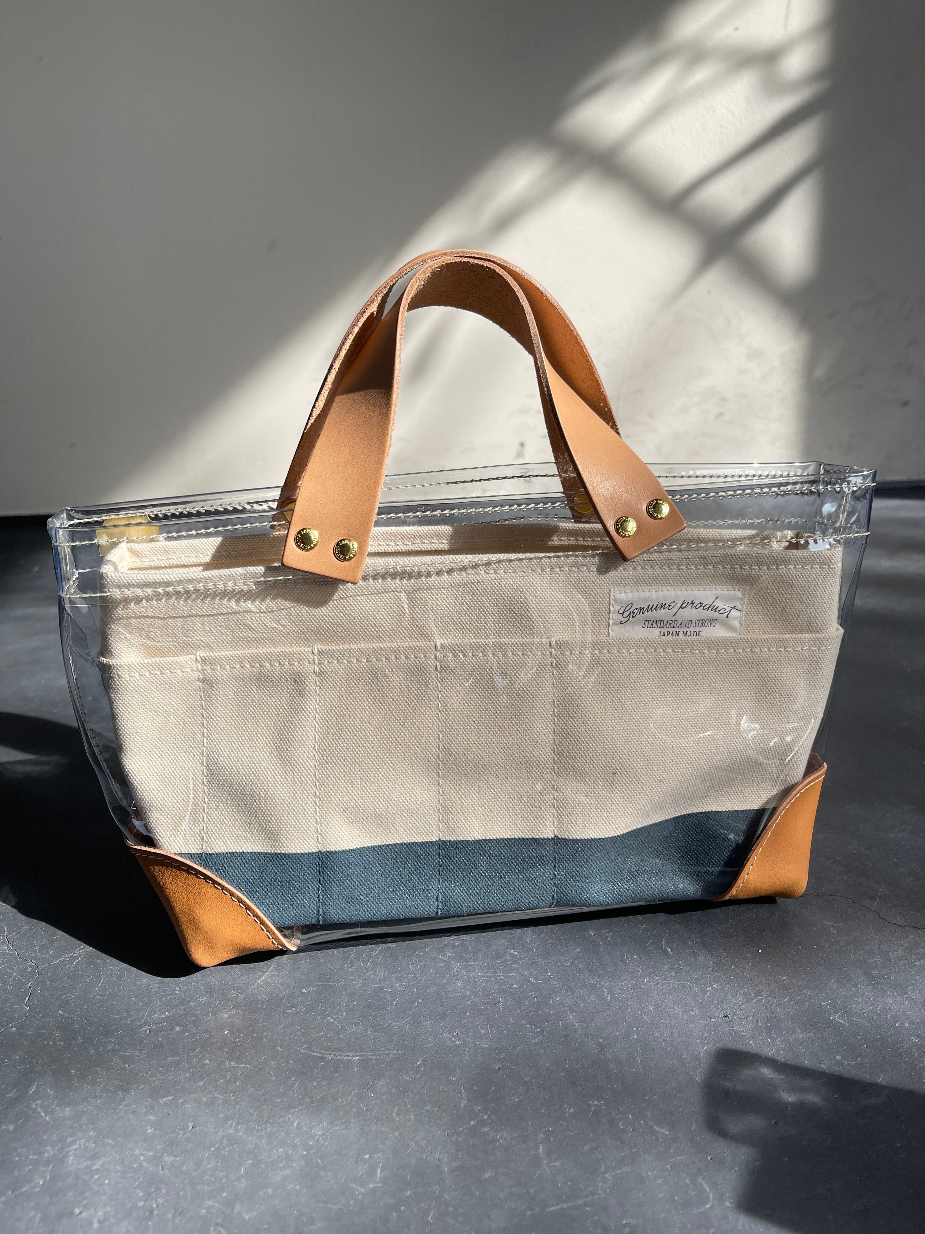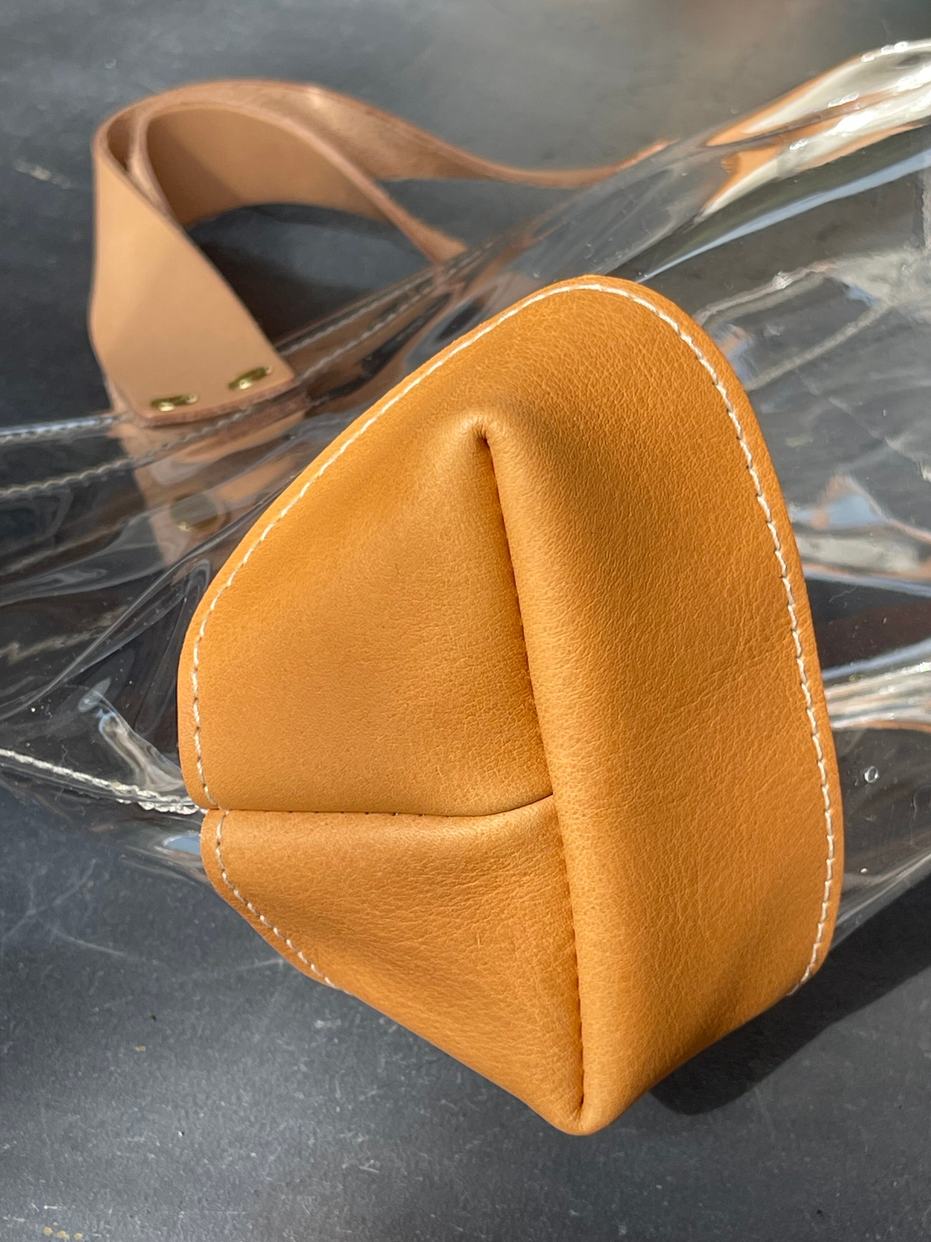 透明なPVC素材にレザーの持ち手と底あてを組み合わせた、軽やかなトートバッグ。
