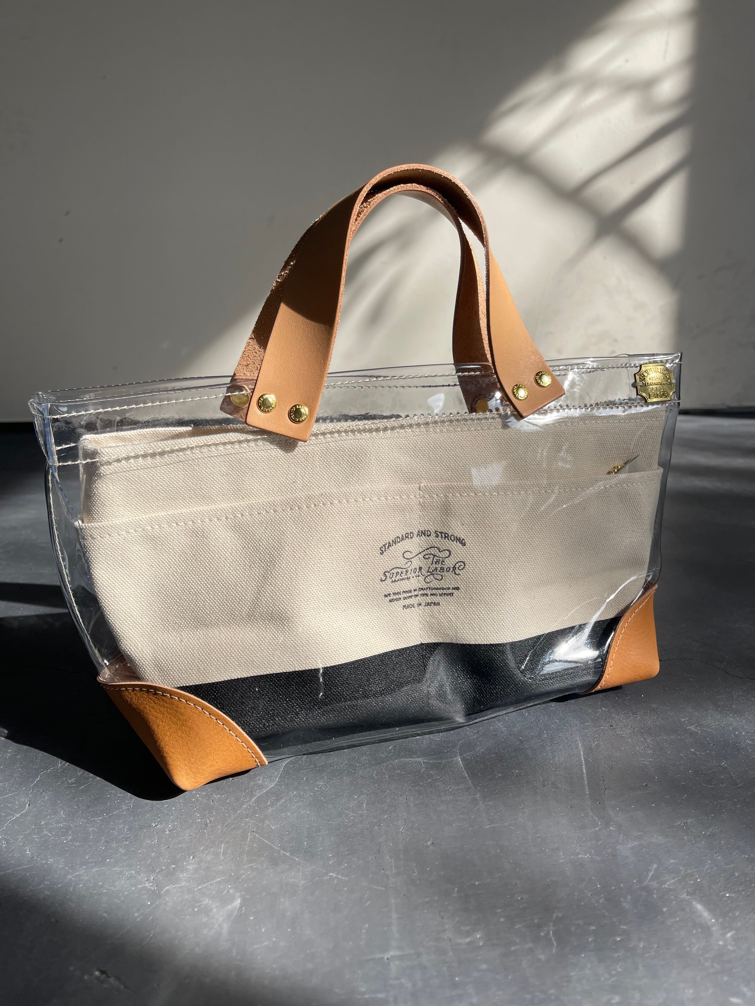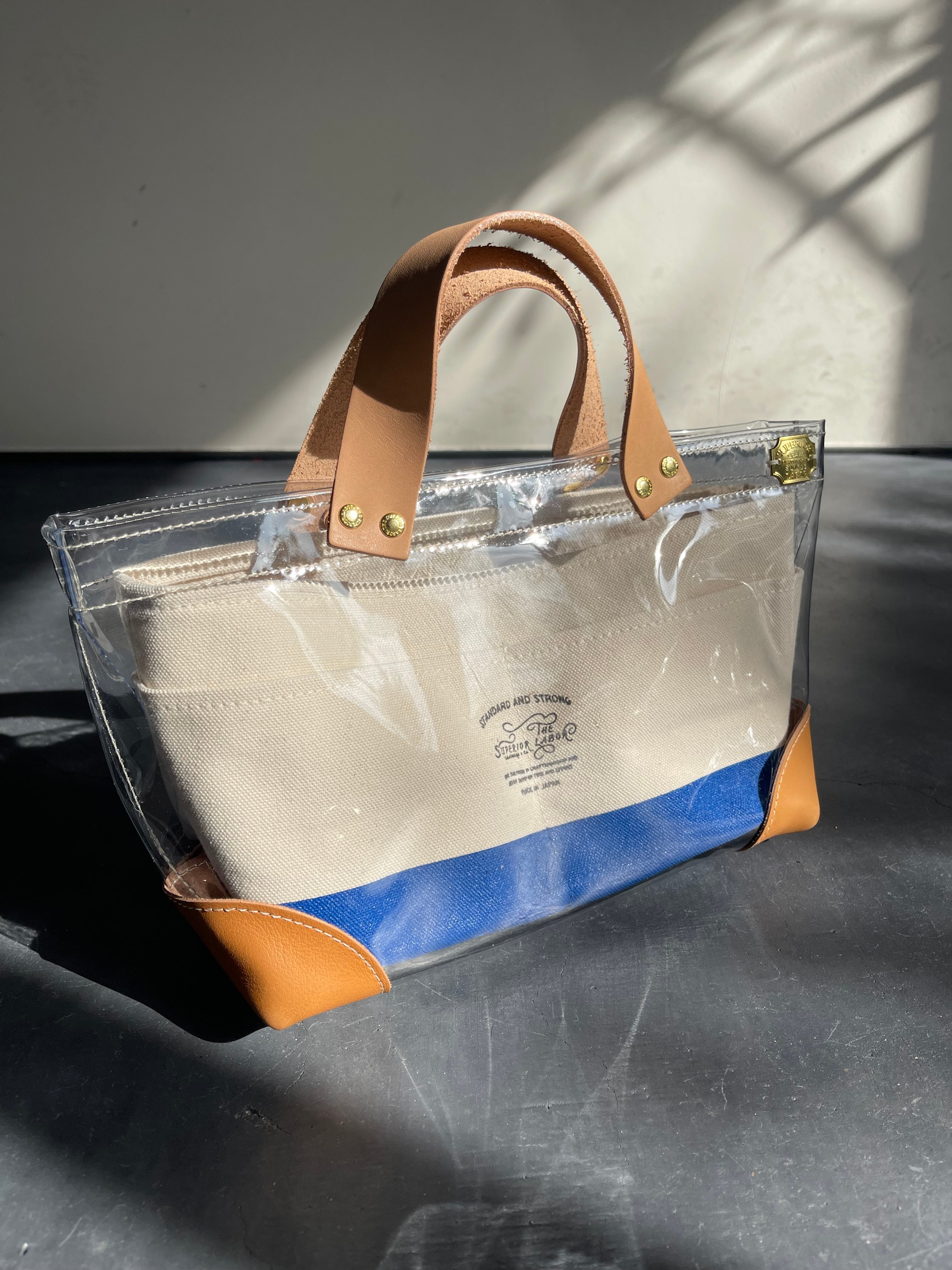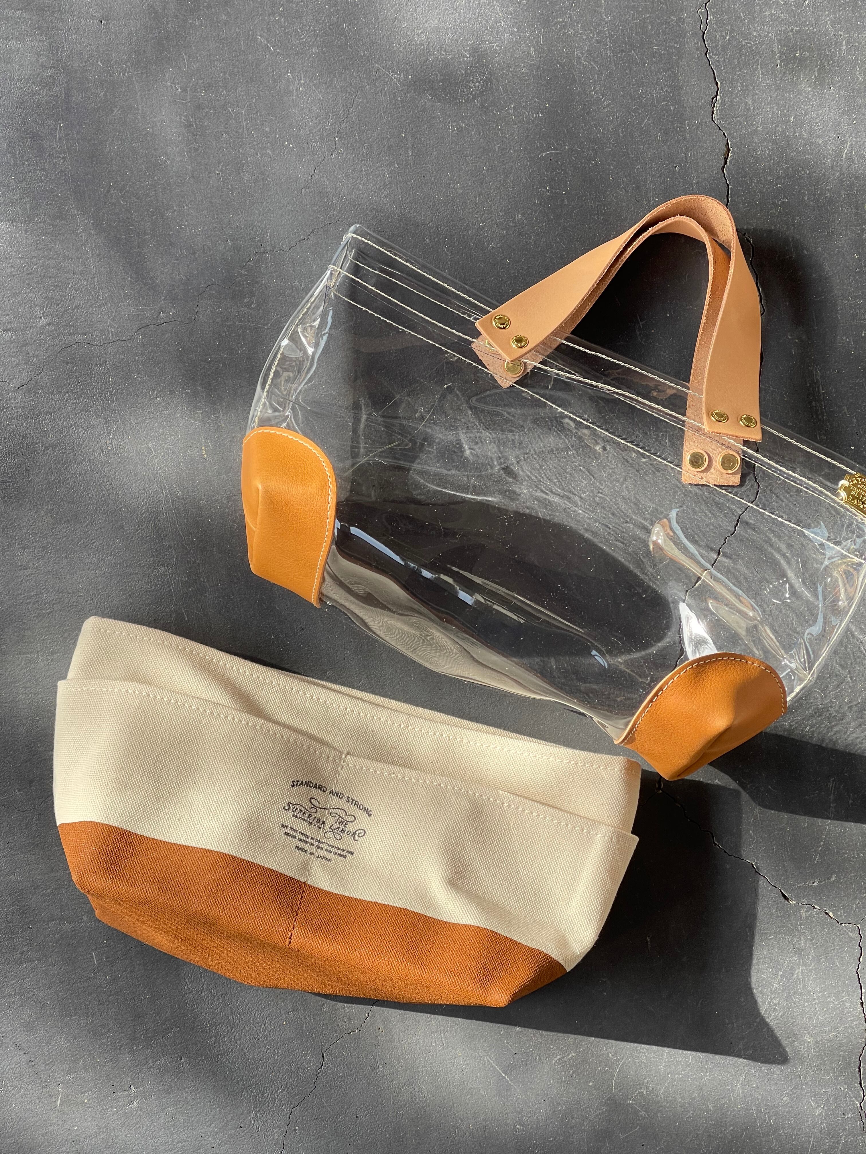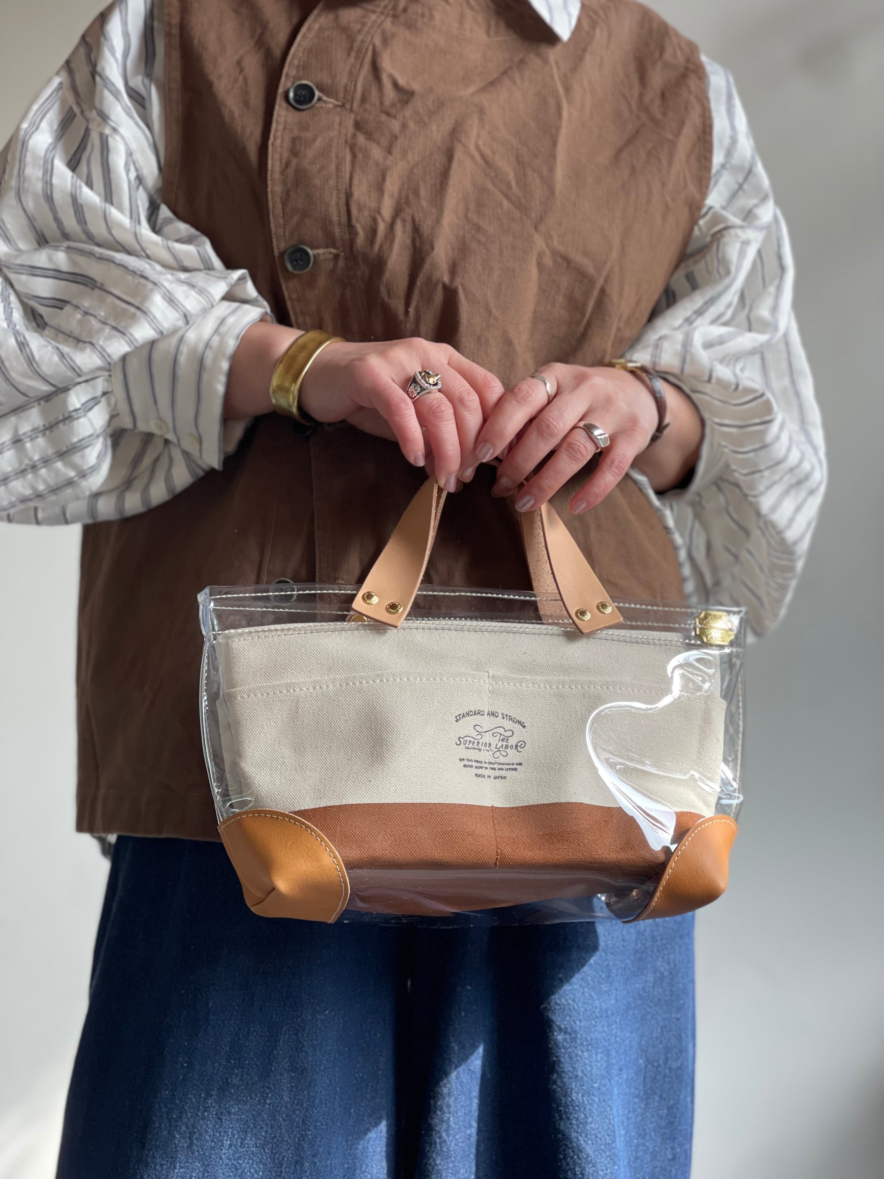 透明なPVC素材にレザーの持ち手と底あてを組み合わせた、軽やかなトートバッグ。