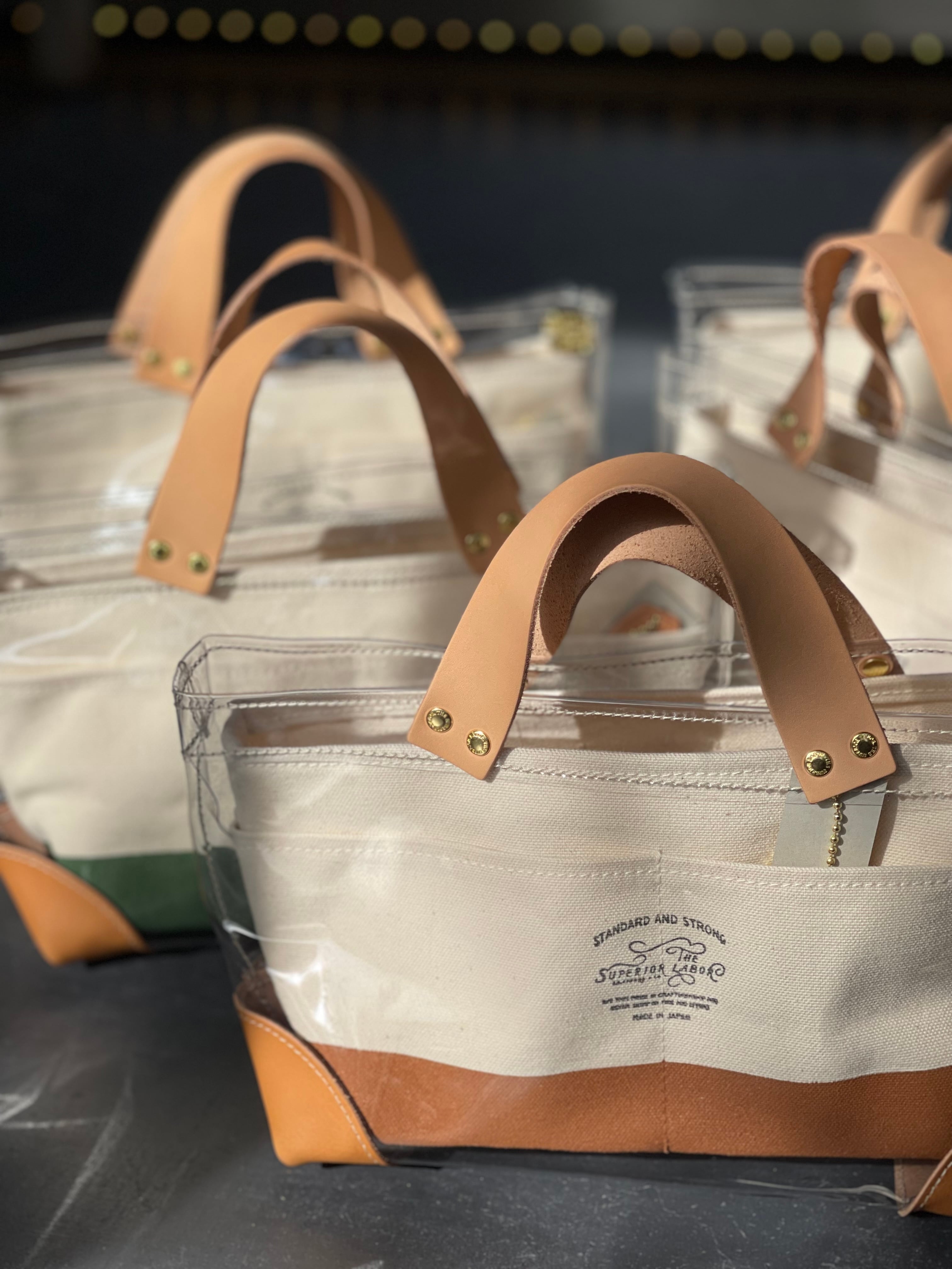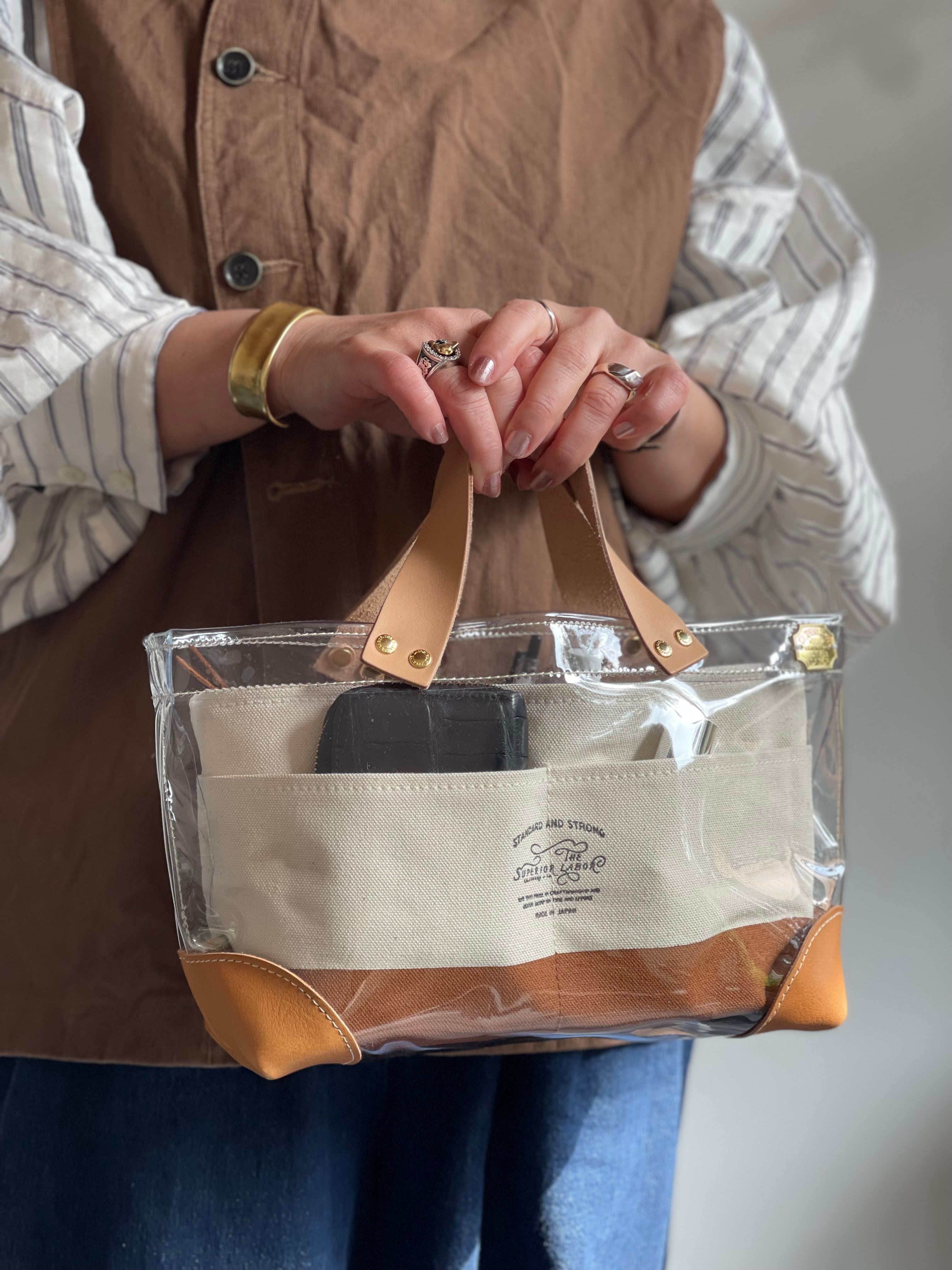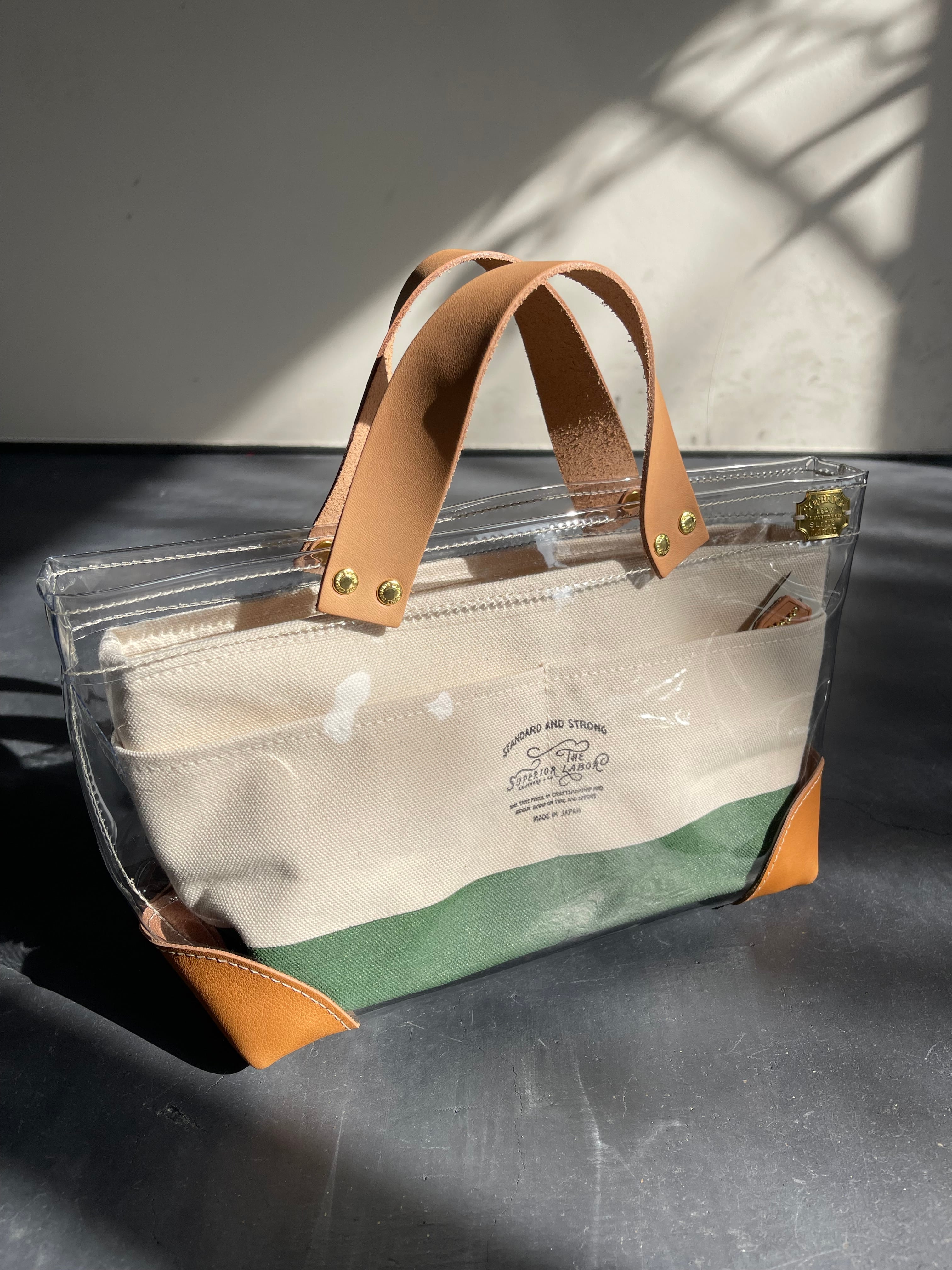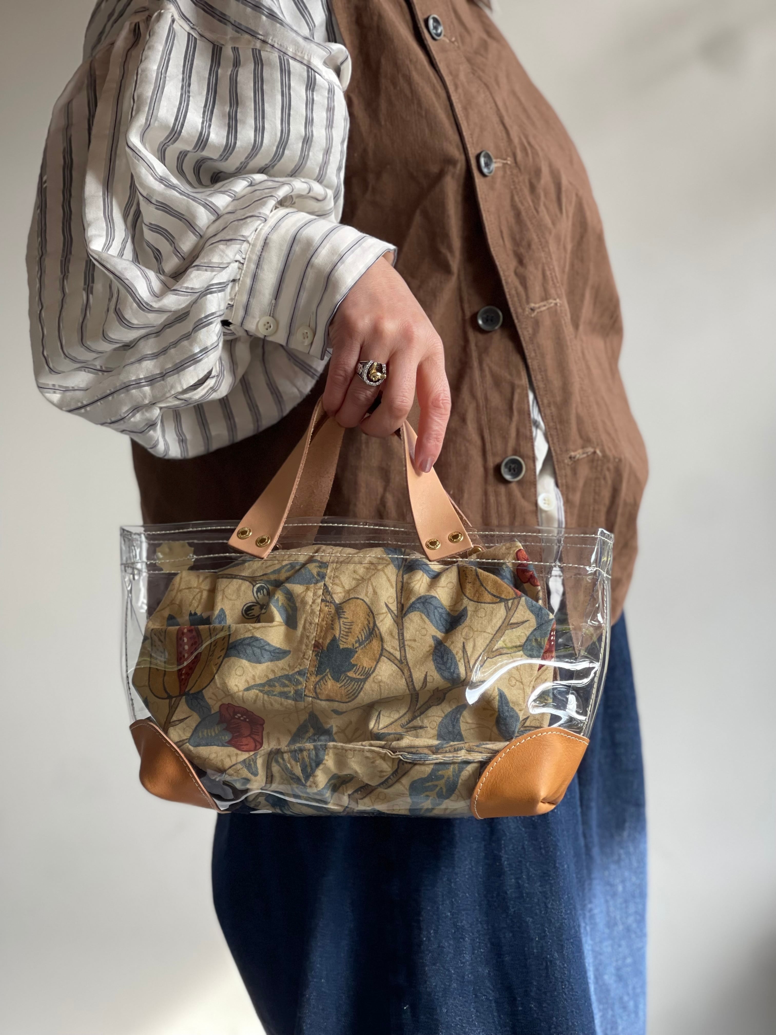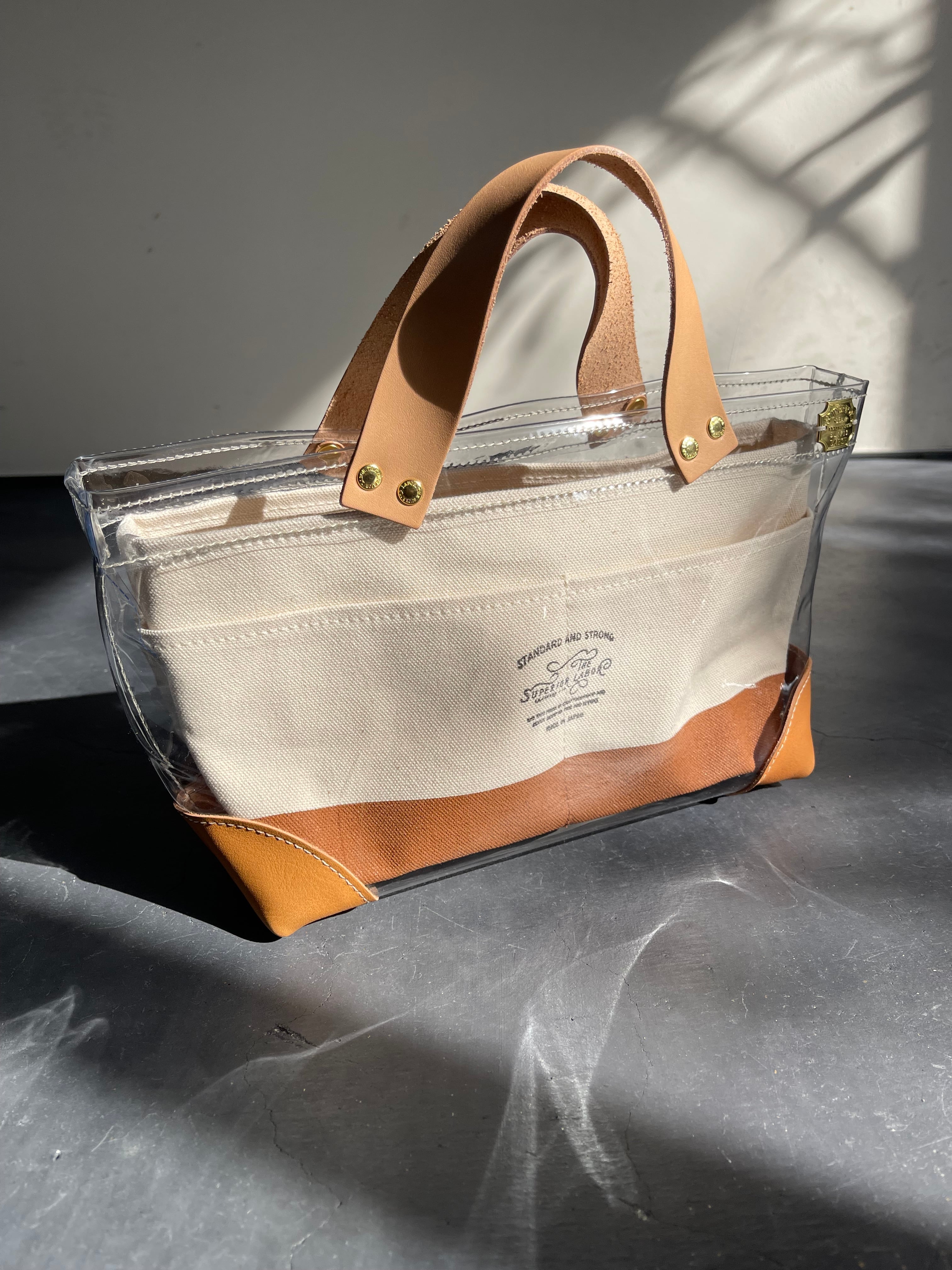 透明なPVC素材にレザーの持ち手と底あてを組み合わせた、軽やかなトートバッグ。
