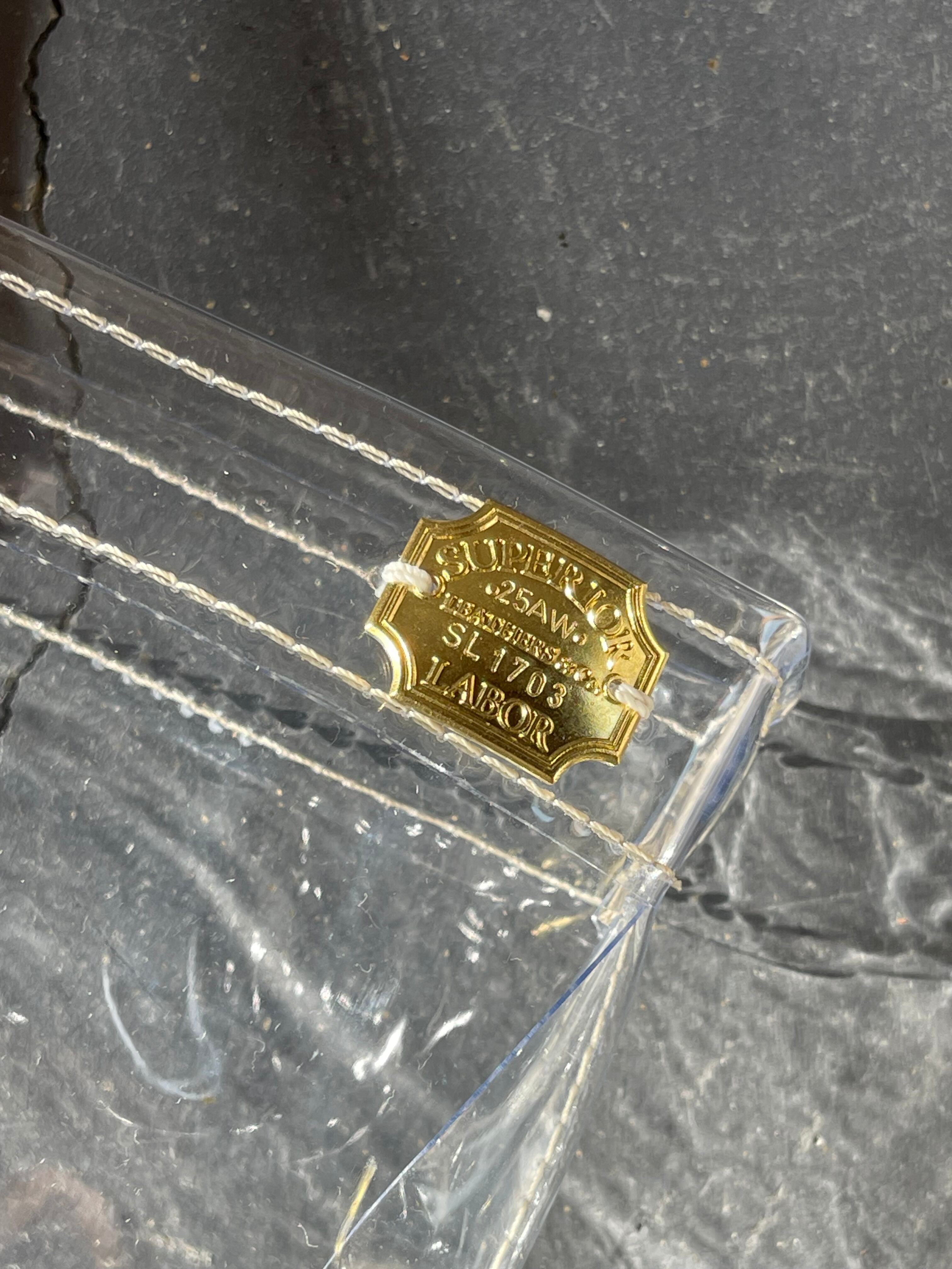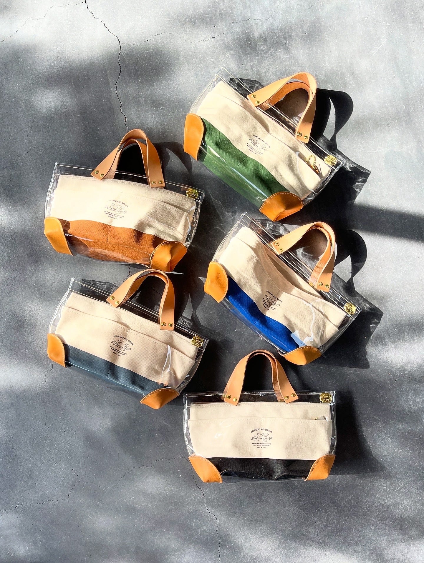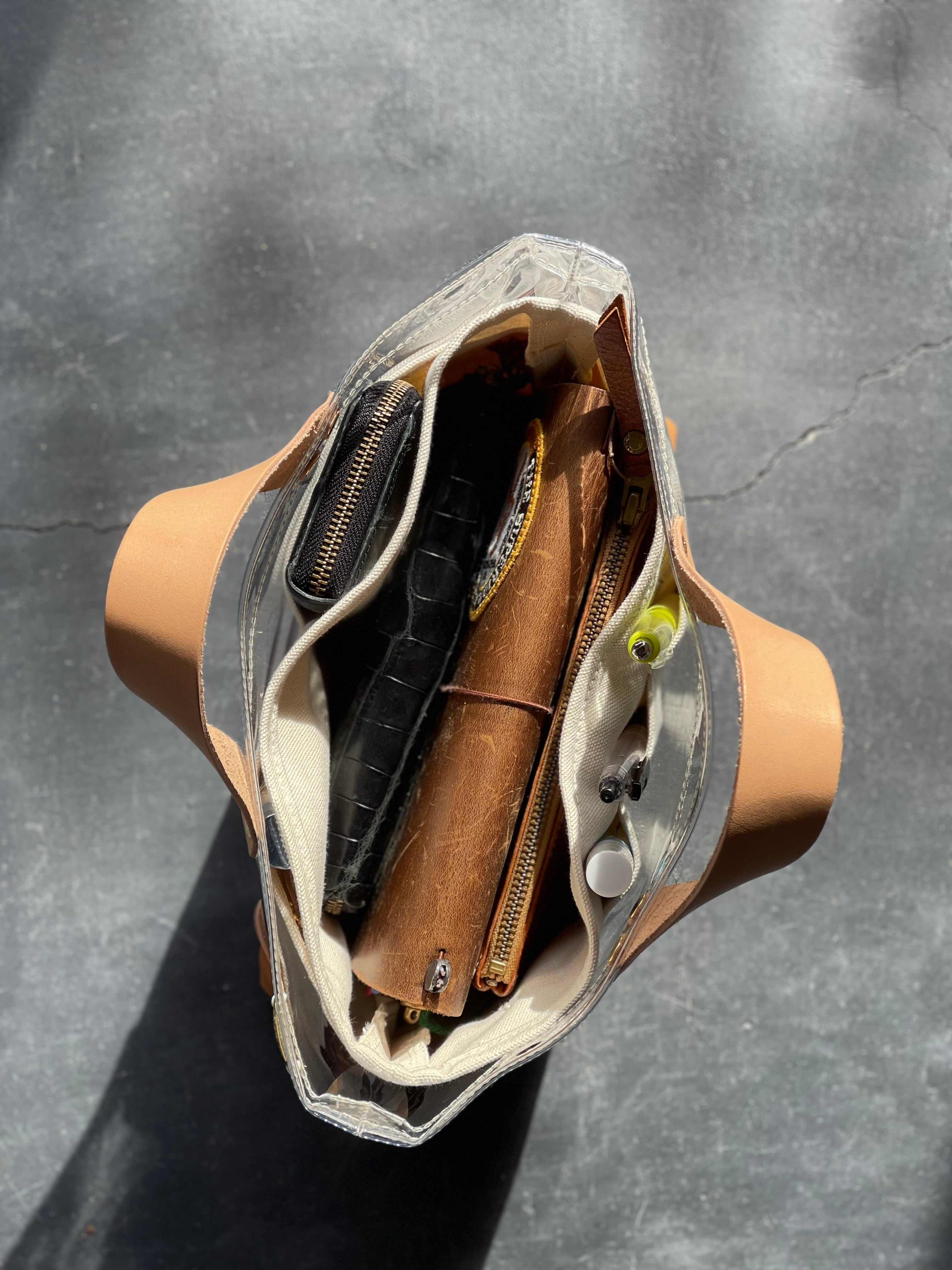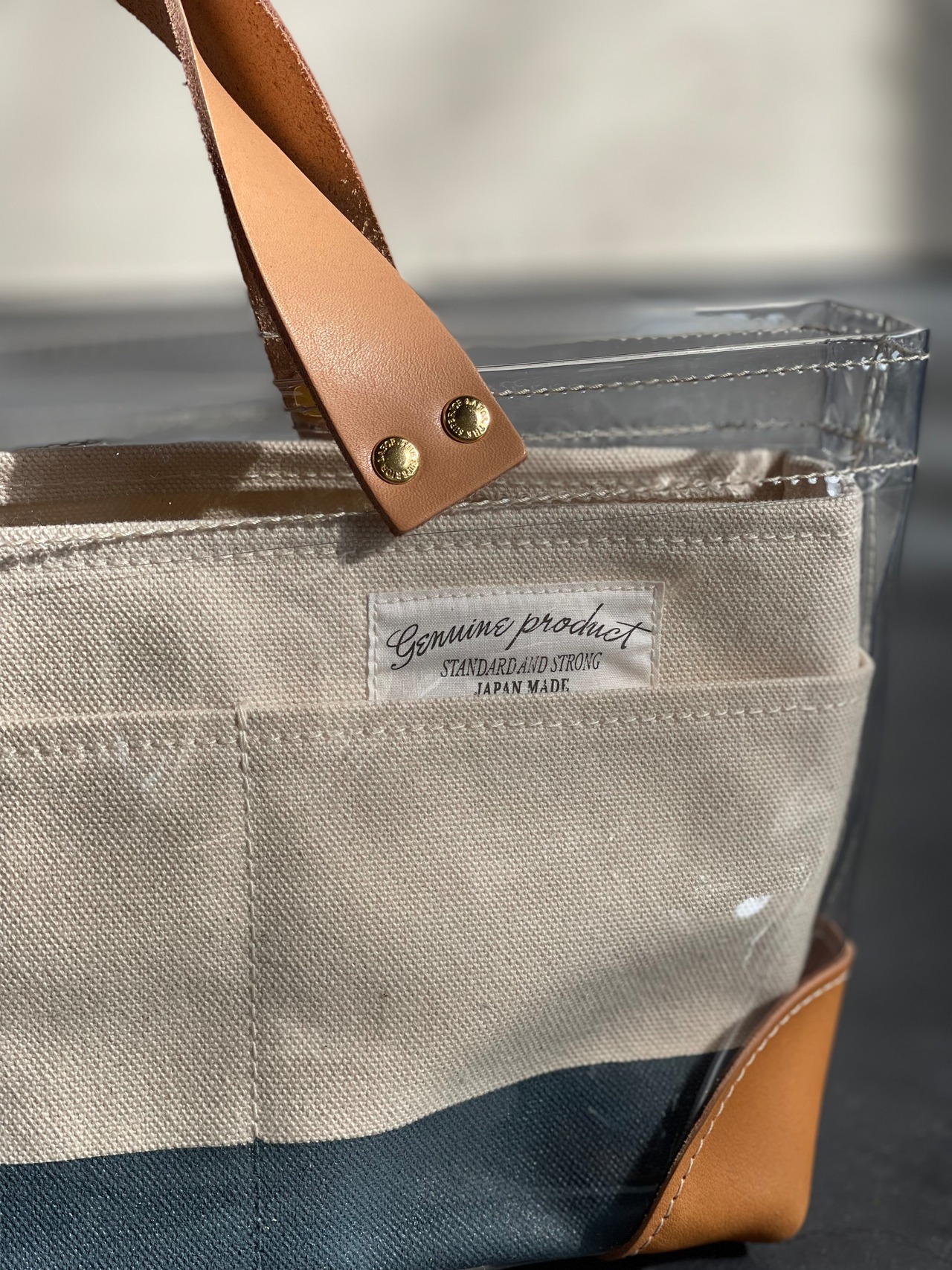 透明なPVC素材にレザーの持ち手と底あてを組み合わせた、軽やかなトートバッグ。