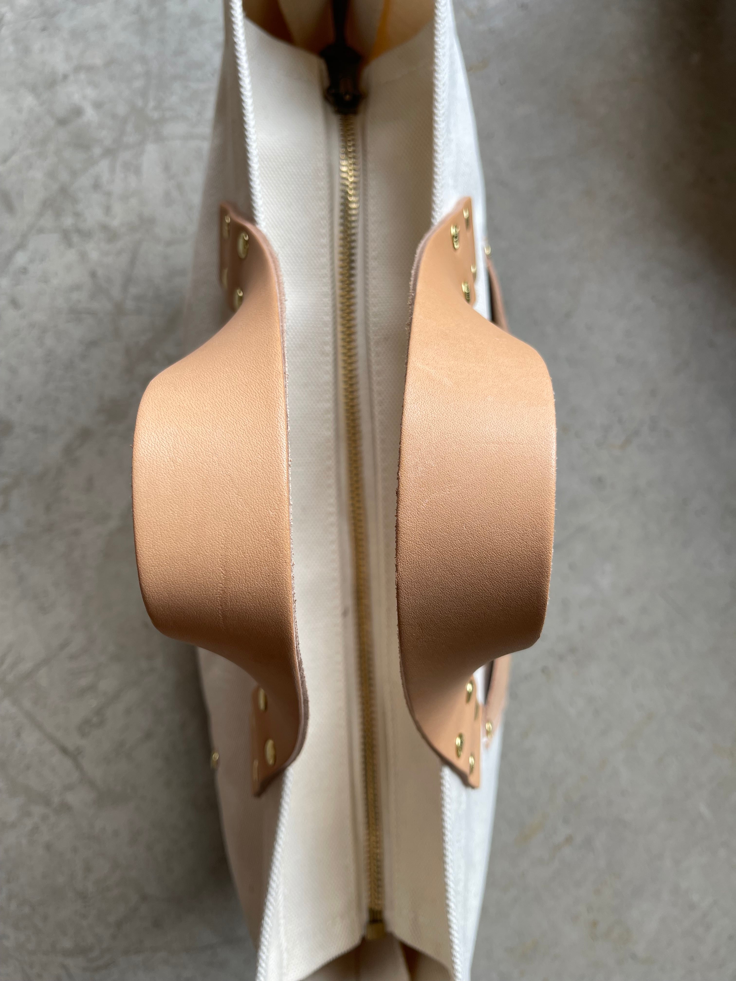 シャトル織機で一日2反しか織ることのできない倉敷産帆布や、東京下町の鋳物工場で作られた真鍮金具、そして、ミモザの樹皮から抽出されたタンニンでなめされた国産のヌメ革。