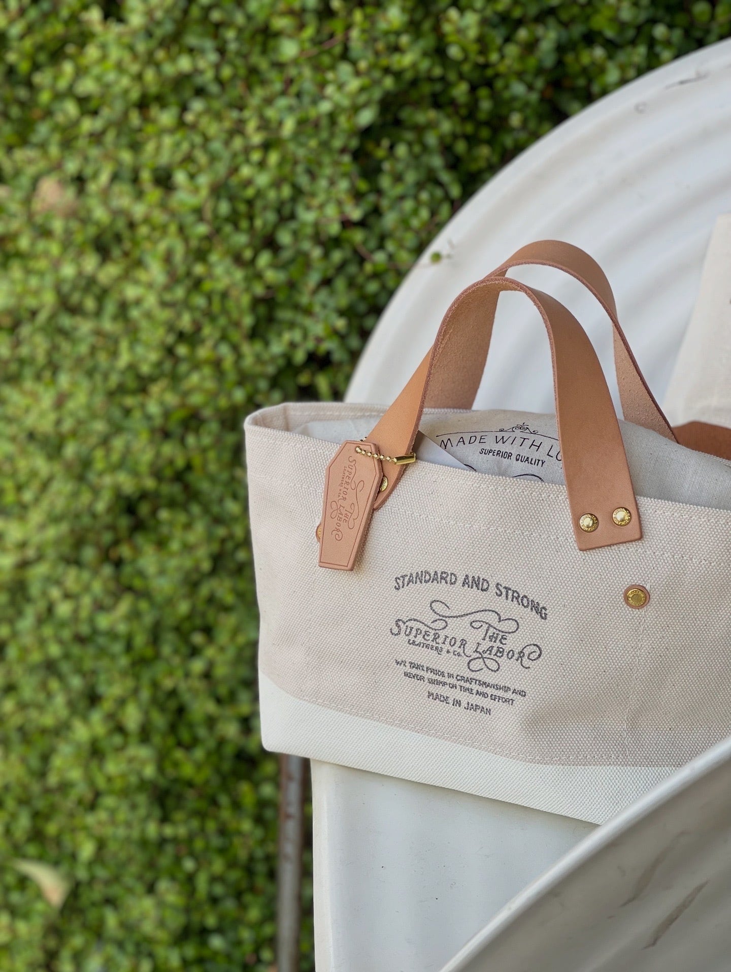 シャトル織機で一日2反しか織ることのできない倉敷産帆布や、東京下町の鋳物工場で作られた真鍮金具、そして、ミモザの樹皮から抽出されたタンニンでなめされた国産のヌメ革。