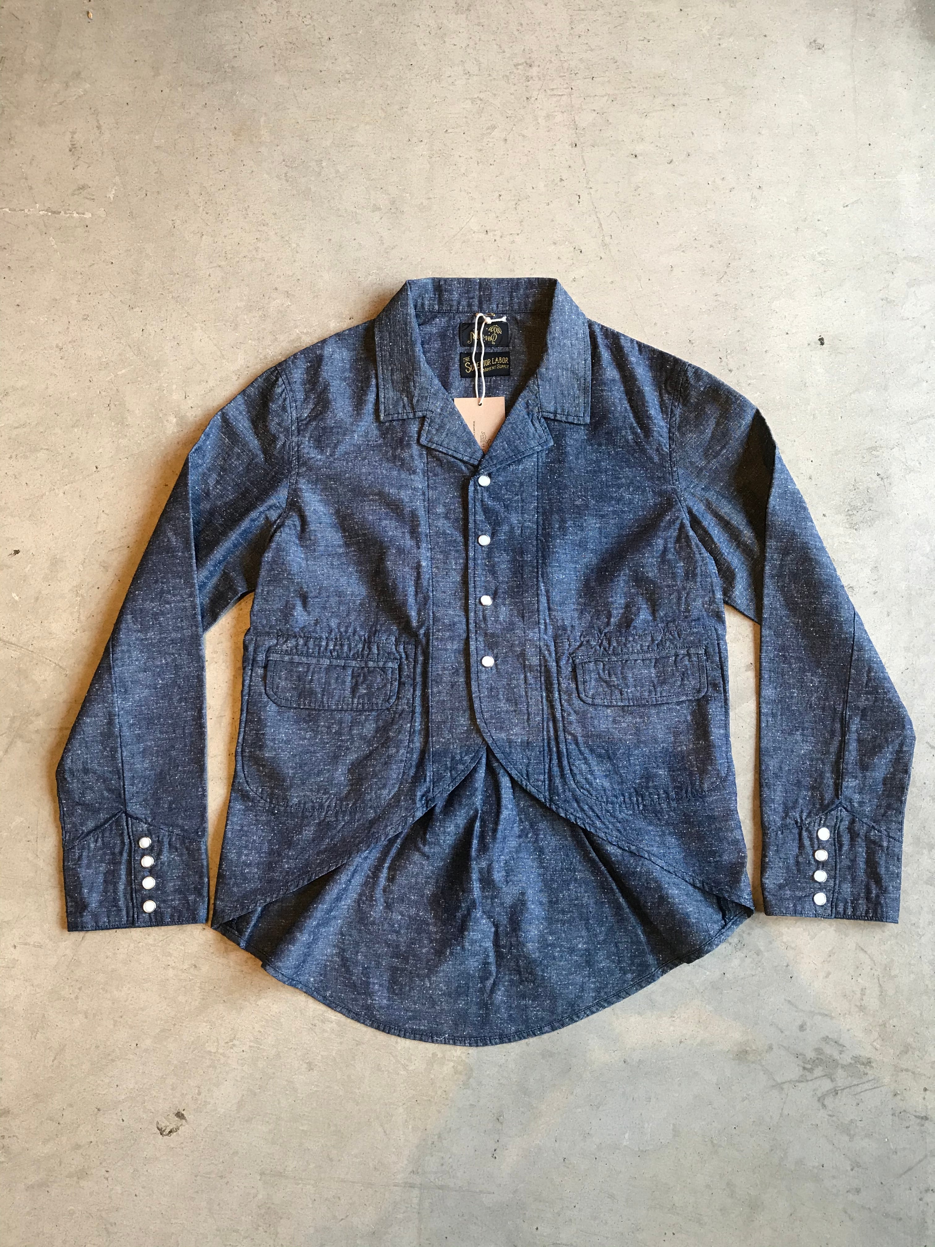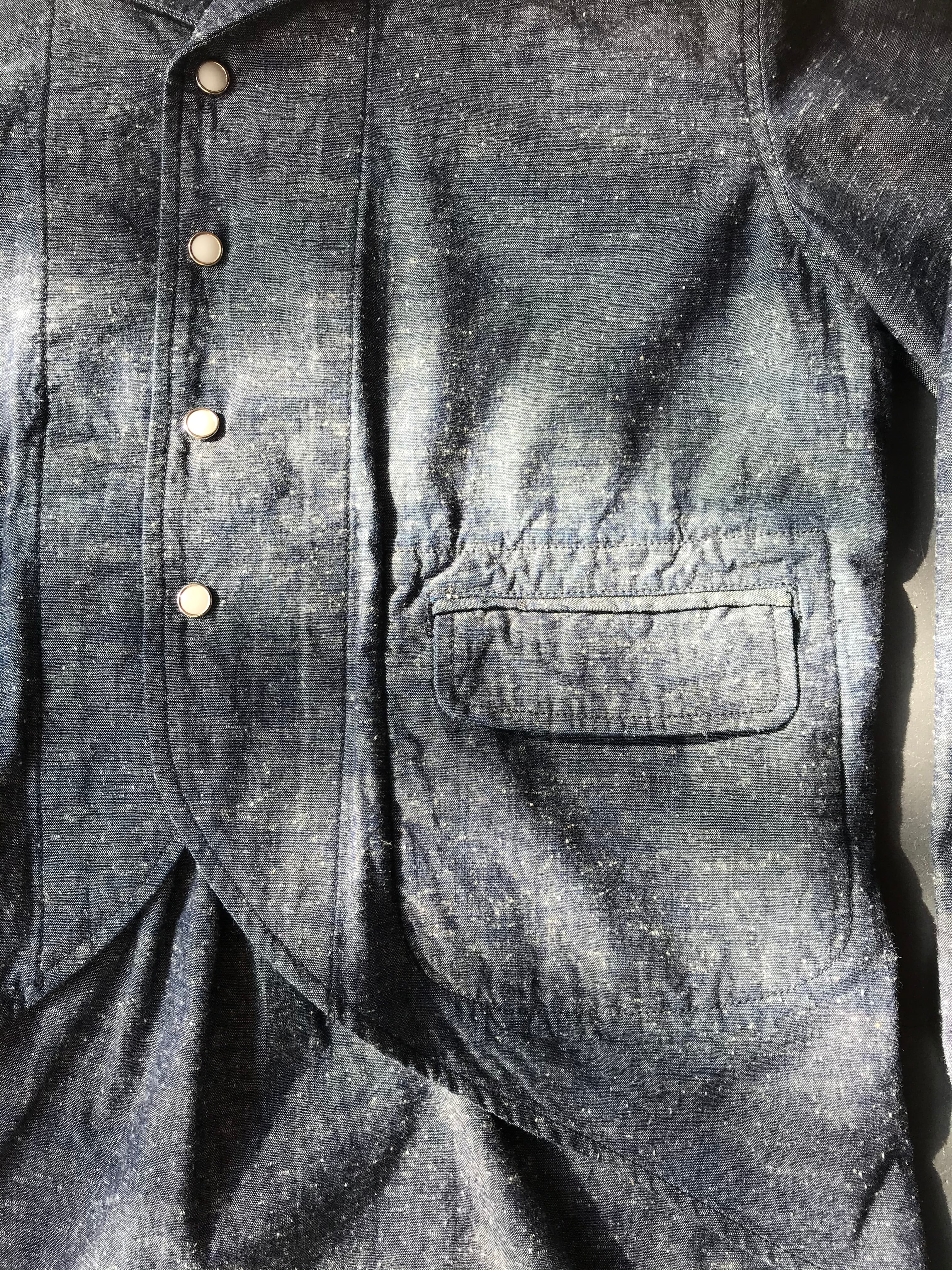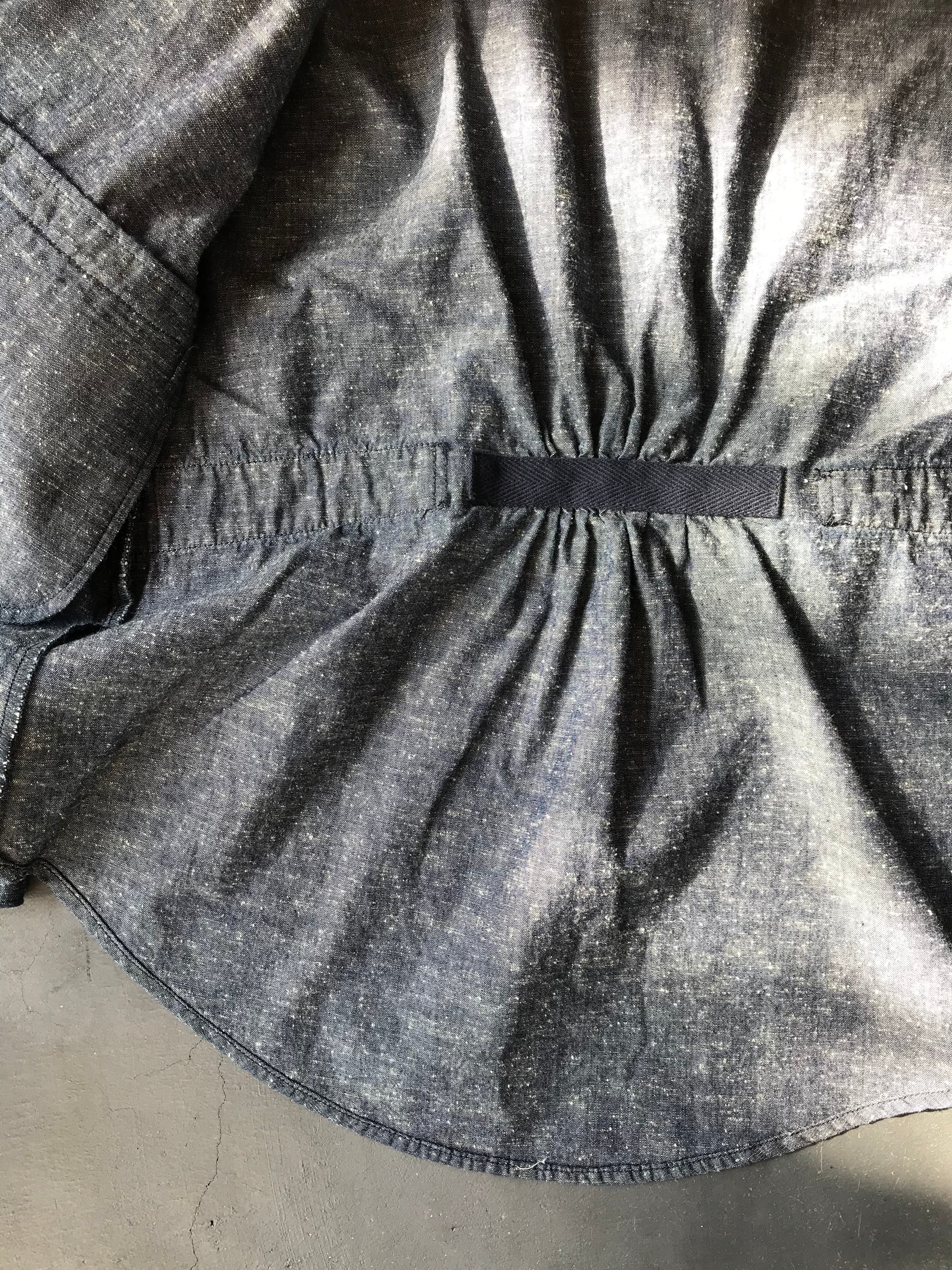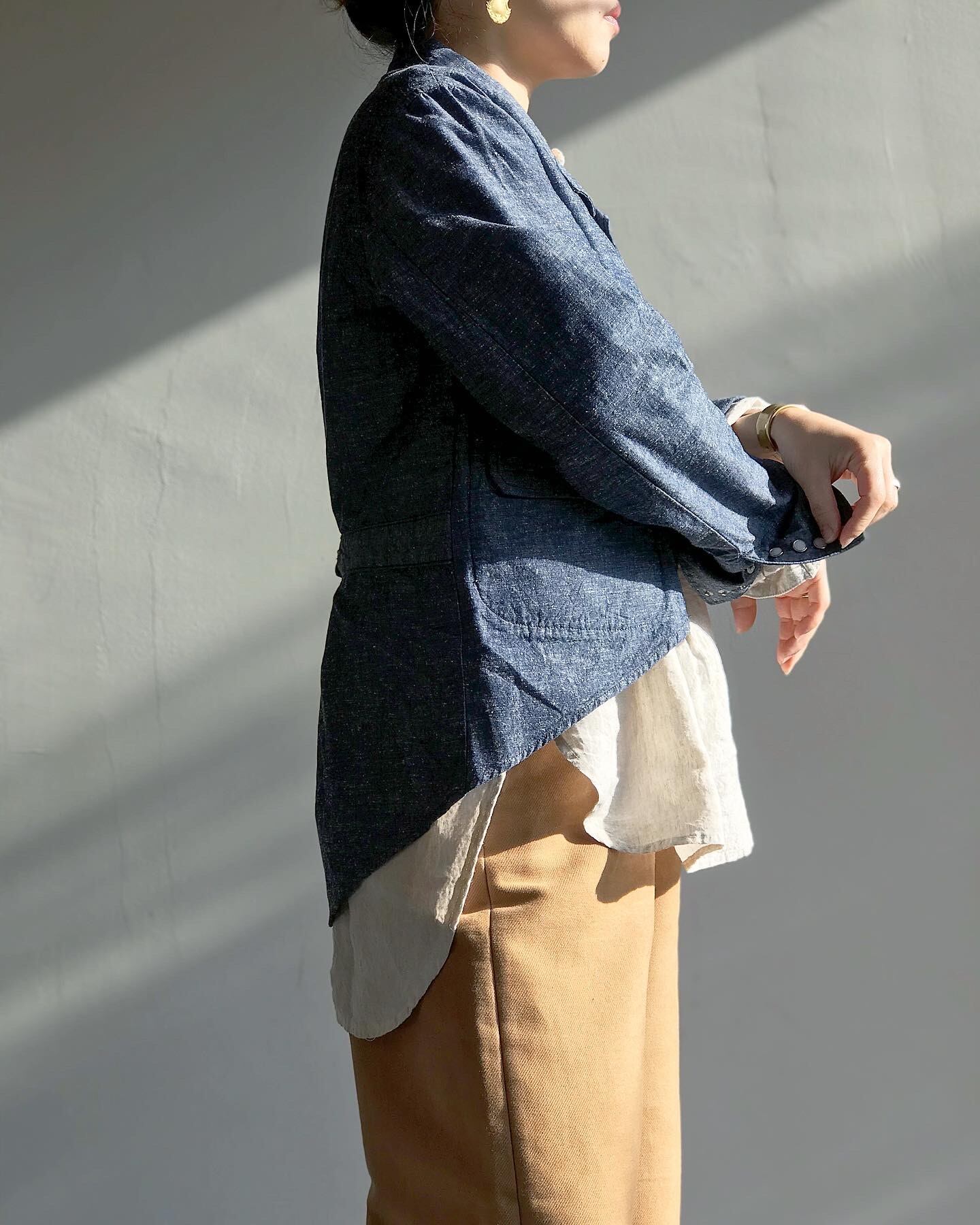 ネップ感のある薄手のデニムシャンブレーを使用しており、シャツの様にも、ジャケットの様にも着て頂ける、通年着用可能なアイテムです。